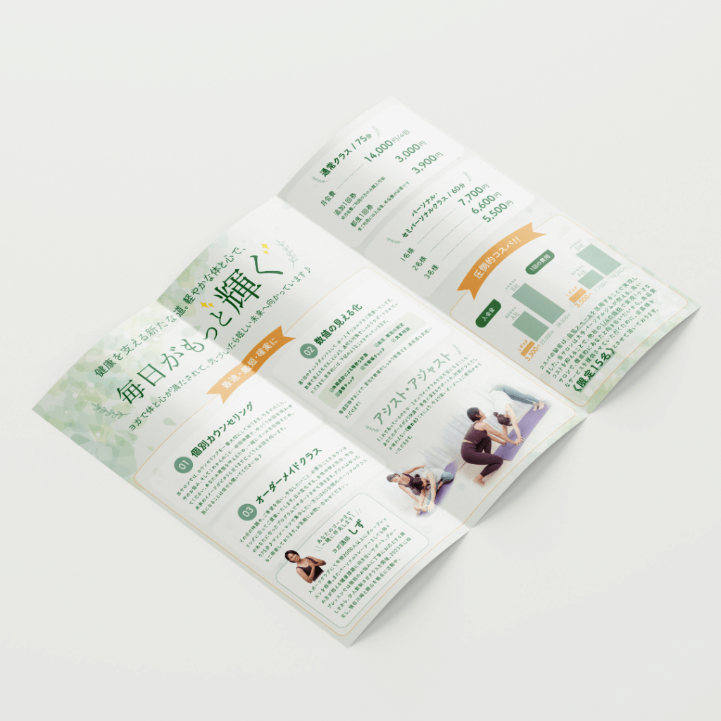 神奈川県川崎市と千葉県館山市でヨガインストラクターをされているしず様のパンフレットデザインを制作させていただきました!
